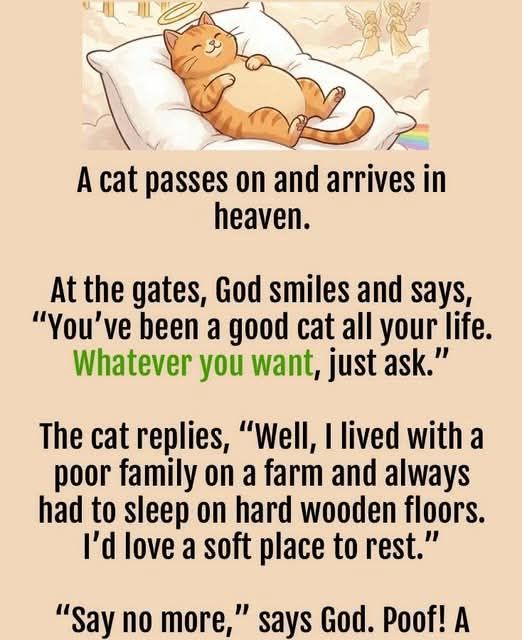A cat passes on and arrives in heaven. At the gates, God smiles and says, “You’ve been a good cat all your life. Whatever you