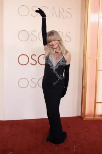 She finished the look with long black opera gloves, soft waves in her signature blonde hair, and understated jewelry that allowed the gown to remain the focal point. In one playful red-carpet moment, Hawn lifted one gloved arm in the air and smiled for photographers, showing the same lively charm that has defined her public image for decades.