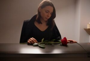 A woman sat in front of the camera. Her face was hidden behind a plain white mask. No background. No emotion. Just stillness.