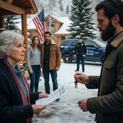 The driver’s door opened and Deputy Marshal Henry Collins stepped out. He tugged off his gloves with deliberate calm, took in the scene—two cars, a locksmith, a cabin, and an older woman standing in the snow between all of them—and nodded once toward me.