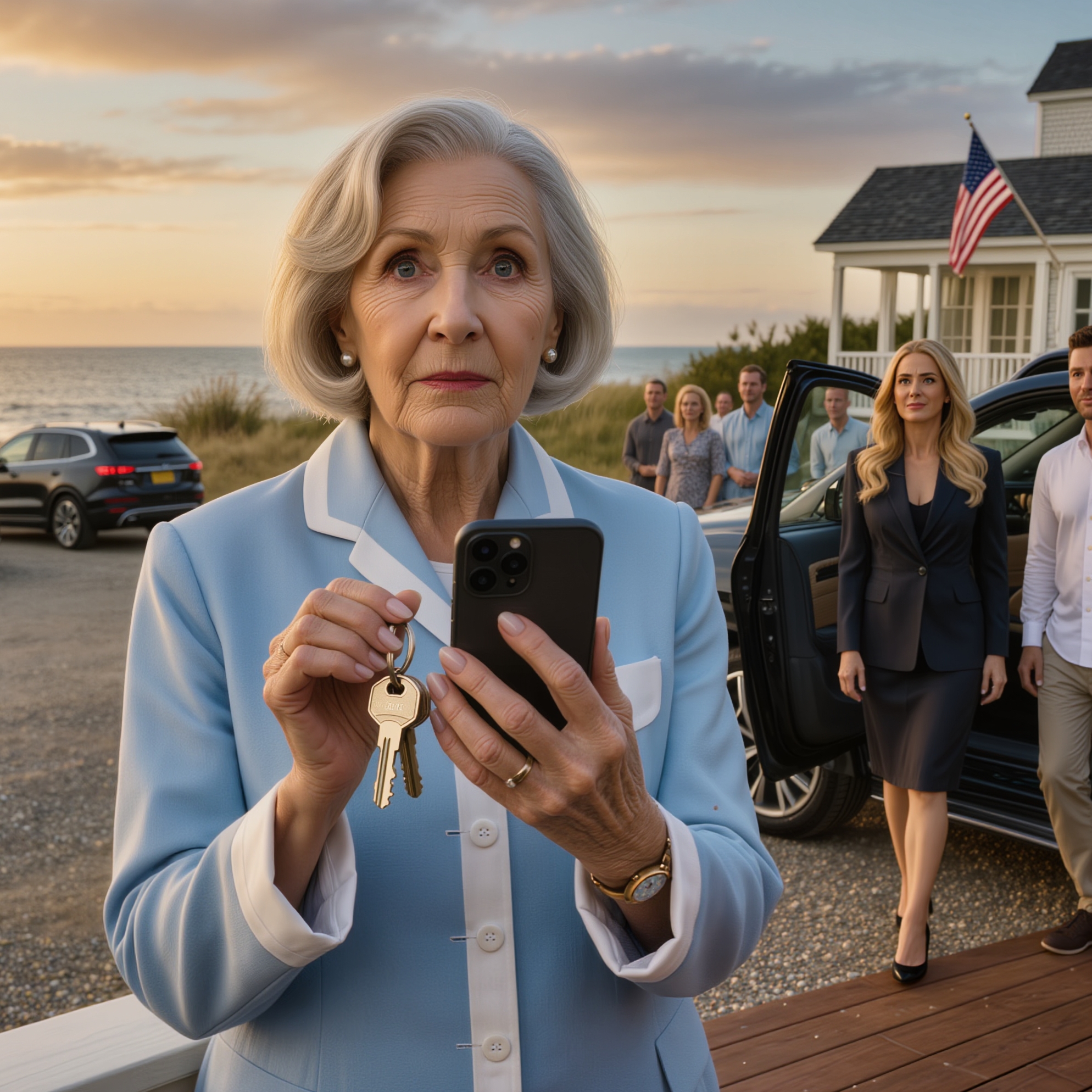 At eleven-thirty a.m., I changed into a simple blue sundress, applied a touch of lipstick, and stepped onto my porch to await my guests. The ocean breeze ruffled my hair as I stood watching the road, hands clasped calmly before me, the very picture of a welcoming hostess.