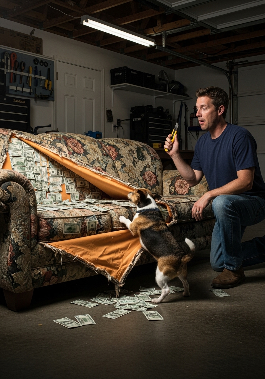 With my heart racing, I grabbed a small utility knife. With shaky hands, I carefully sliced a clean opening in the frayed fabric right where Wasabi had aimed. I pulled it away…and stopped in my tracks. Hidden away between the couch’s frame and its stuffing were stacks of banknotes, tucked in like a secret stash waiting to be discovered. I gasped as I pulled out stack after stack of cash, spreading them on the floor in disbelief.