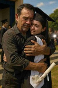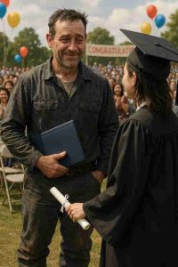 When the ceremony ended, he pushed through the crowd until he reached me. He hugged me so tightly I could feel the grit on his clothes pressing into my gown. Someone nearby snapped a photo—me holding my diploma in one hand, his greasy handprint smudged across the white fabric. I laughed for the camera, but inside, my stomach was twisting.
