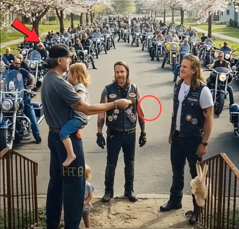 A few nights later, Adam sat at home, unpaid bills stacked on the table, when he heard it—the low rumble of engines. At first faint, then louder, until the street outside shook. Forty motorcycles lined up along the curb, chrome glinting under the dawn light. Adam froze, shielding Lily behind him.