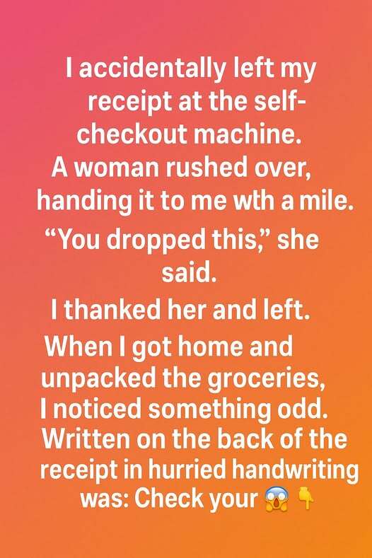 Hours later, while unpacking groceries in the kitchen, I pulled out the crumpled receipt and noticed something odd. On the back, scrawled in messy, hurried handwriting, were four chilling words: “Check your car trunk.”